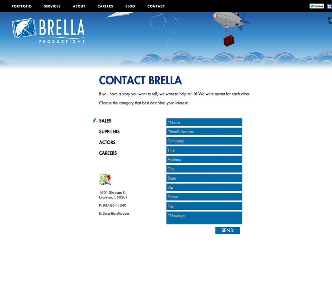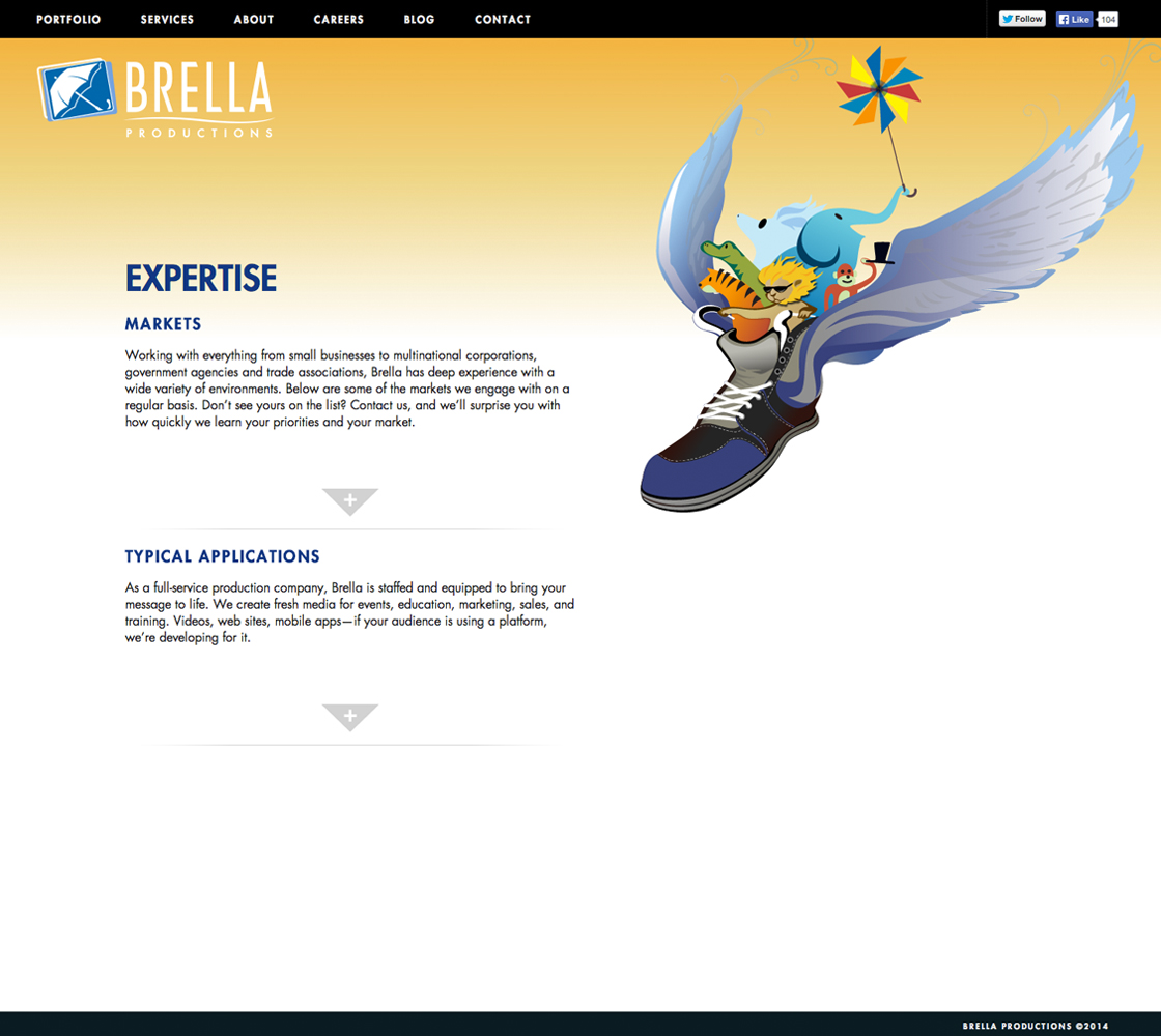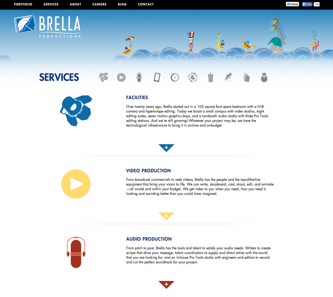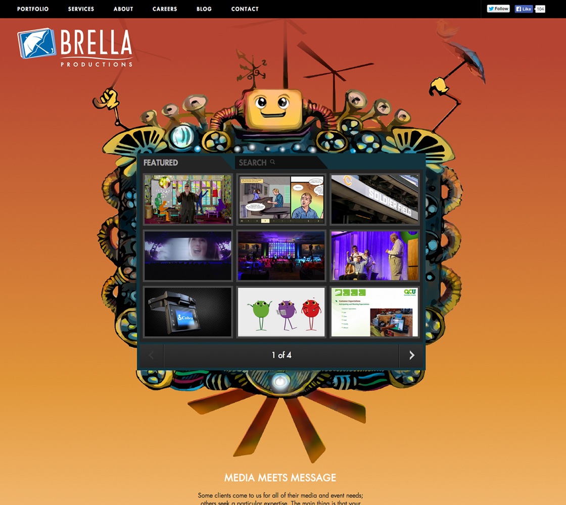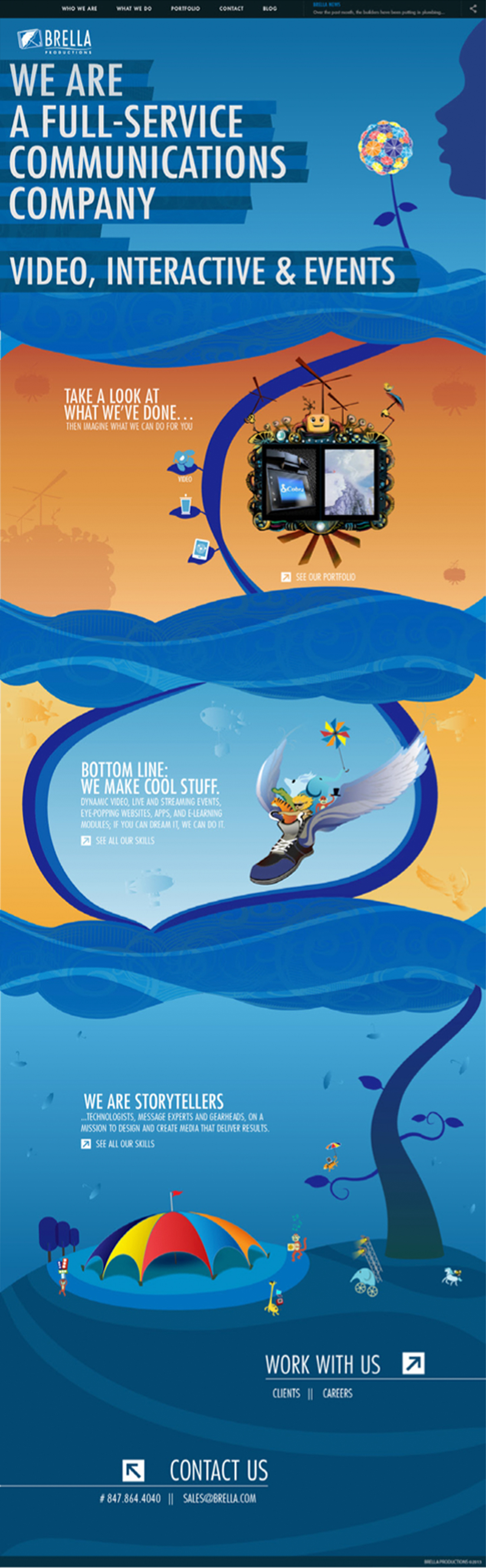 While in Chicago I was working at my old position at Brella Productions one of my major assignments was designing our companies own website and many of our marketing components. The company had a very unusual environment that was extremely colorful, playful, and all around enjoyable atmosphere which was reflected in all of our work. We ended up with several variations of our homepage; some being extremely simple in their required designs while others where on the opposite spectrum and included various parallax components while always retaining a visual capability on all devices and platforms. The Homepage concept shown here was on the severely complex end of the spectrum and was a beautifully intricate design that had all components moving on different speeds and as the user scrolled each section would have movement all over but settle for a bit during each appropriate stage of the website with respect to the audiences screen size. The visual elements involved here were created in collaboration with the other designer working there, but when I came to the homepage I elaborated it quite a bit and built upon all of the website components. I left my position at Brella at the end of June to move to California and to my knowledge they have not updated their website with this design. Probably because they are busy creating amazing projects for their clients.