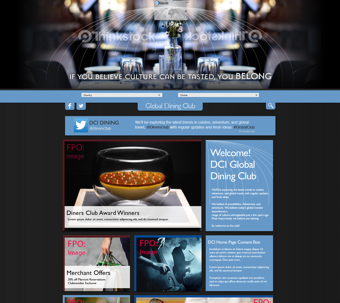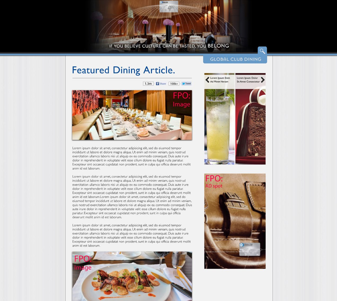 It was a great honor to receive the lead designer roll on this huge project. While this project was made a couple years ago it was huge turning point in my career where I was given an incredible amount of trust and free range on aesthetics. Something a young designer craves when in their initial years. The client wanted to start a professional blog site for the best restaurants and dining experiences in the world. I created this design that had percentage based content areas that would adapt to every device and platform. A navigation bar housing their social links and custom search that became fixed once it hit the top of the screen and a custom texture background that I made to resemble the finest silky tablecloth. Unfortunately this project requires a large department of employees internally with global food critics partnered with professional photographers for content creation. Hence the reason for watermarks, FPO Stamps and Lorem Ipsum. While the project never entered the development stage its designs continue to be held closely by our clients in hopes to find a suitable project for its reuse. Unfortunately I parted ways with from the company I was working for to ever see that day come true for the client.