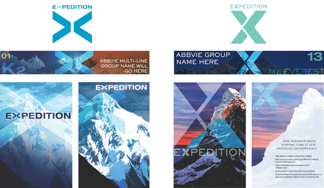 It was an absolute privilege to work with this incredible company that is ranked in the top five of biotech and pharmaceutical companies in the world. This client had a wide range of visual project requests that were mainly for their events and conference presentation needs. They never had a shortage of wild or extravagant visual requests. This particular project shown here is a portion of the themed event for their global gathering that I largely contributed to creating. The obvious theme here is the Expedition concept that was part of the larger metaphor for exploring new heights and finding success in terrains that would frighten everyone else. We designed everything from the standing signs shown here to trinkets, agenda booklets, Jumbotron graphics, PowerPoint templates, key chains, miniature booklets, and variety of other signage needs that came in all sizes and dimensions that had interchangeable components so signs could be reusable, cutting down on wasted materials and saved the client a large amount of their print budget.